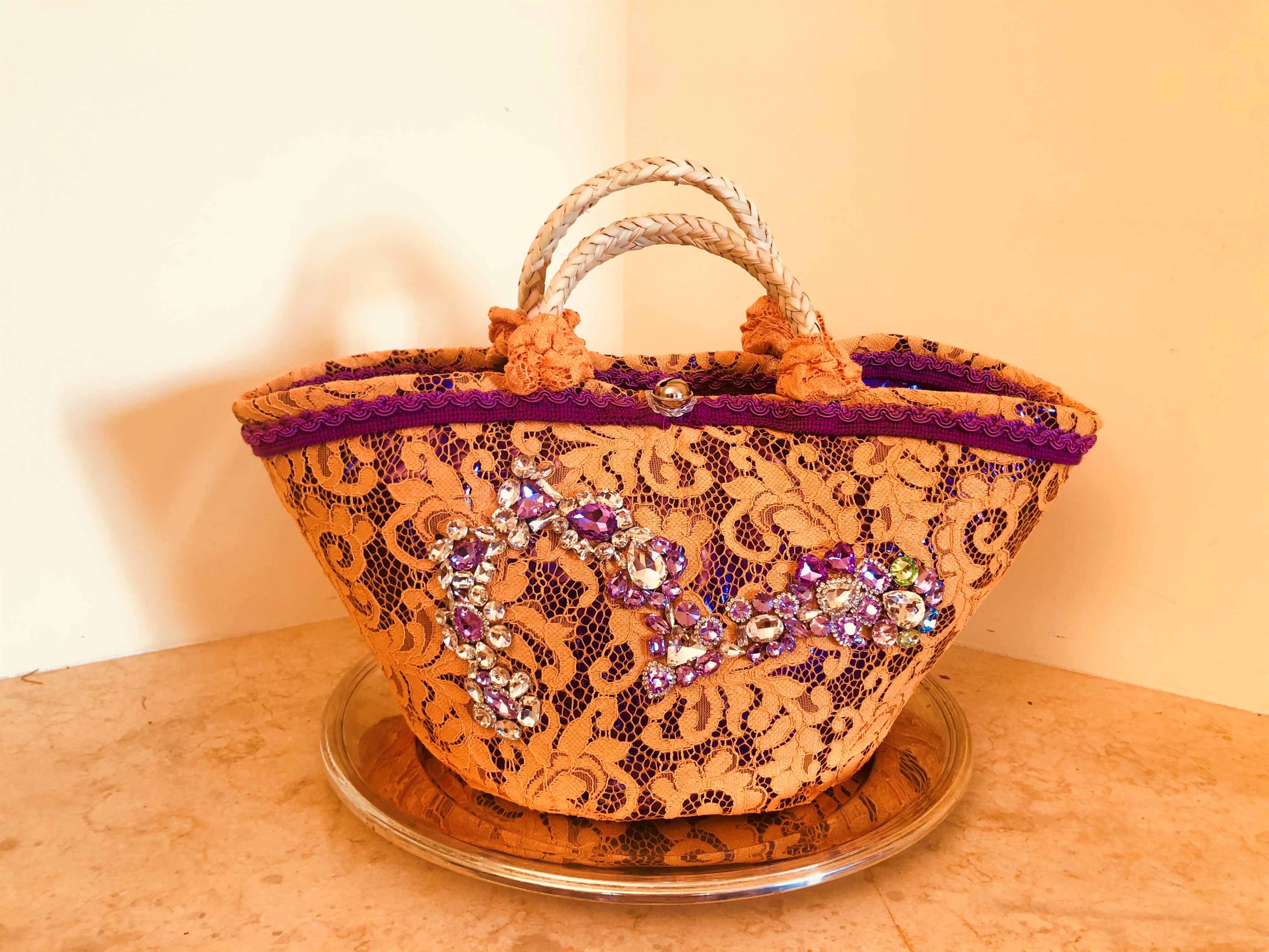 Coffa siciliana in palma nana intrecciata rivestita in pizzo elasticizzato corallo e tessuto in vernice gialla. Rifinito con passamaneria tessuta a mano e decorato con gemme colorate. Sonaglio di chiusura. Pezzo unico.